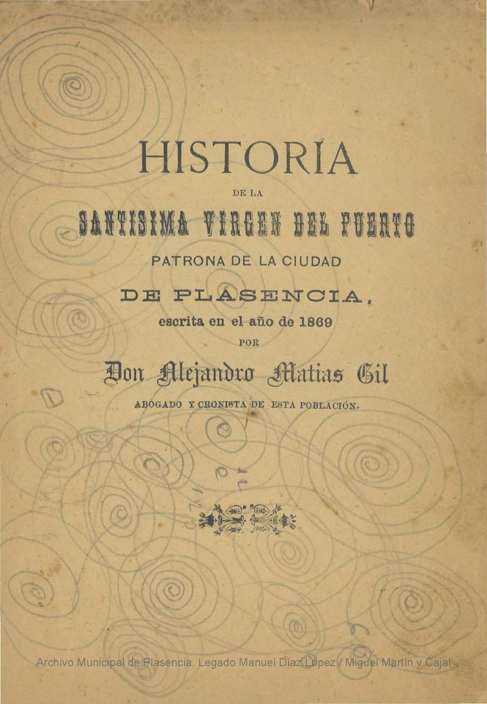 El primero de los libros es “Historia de la Santísima Virgen del Puerto, Patrona de la Ciudad de Plasencia, escrita en el año de 1869 por Alejandro Matías Gil”, abogado, historiador y poeta placentino del siglo XIX. Formado en el Seminario de Plasencia y en las universidades de Salamanca y Madrid, donde se licenció en Derecho, desarrolló una destacada trayectoria intelectual, combinando el ejercicio de la abogacía con una intensa actividad literaria e historiográfica. Autor de diversas obras sobre la ciudad, entre las que destaca “Las siete centurias de la ciudad de Alfonso VIII” de 1877, su producción refleja un profundo interés por rescatar y difundir el pasado placentino.