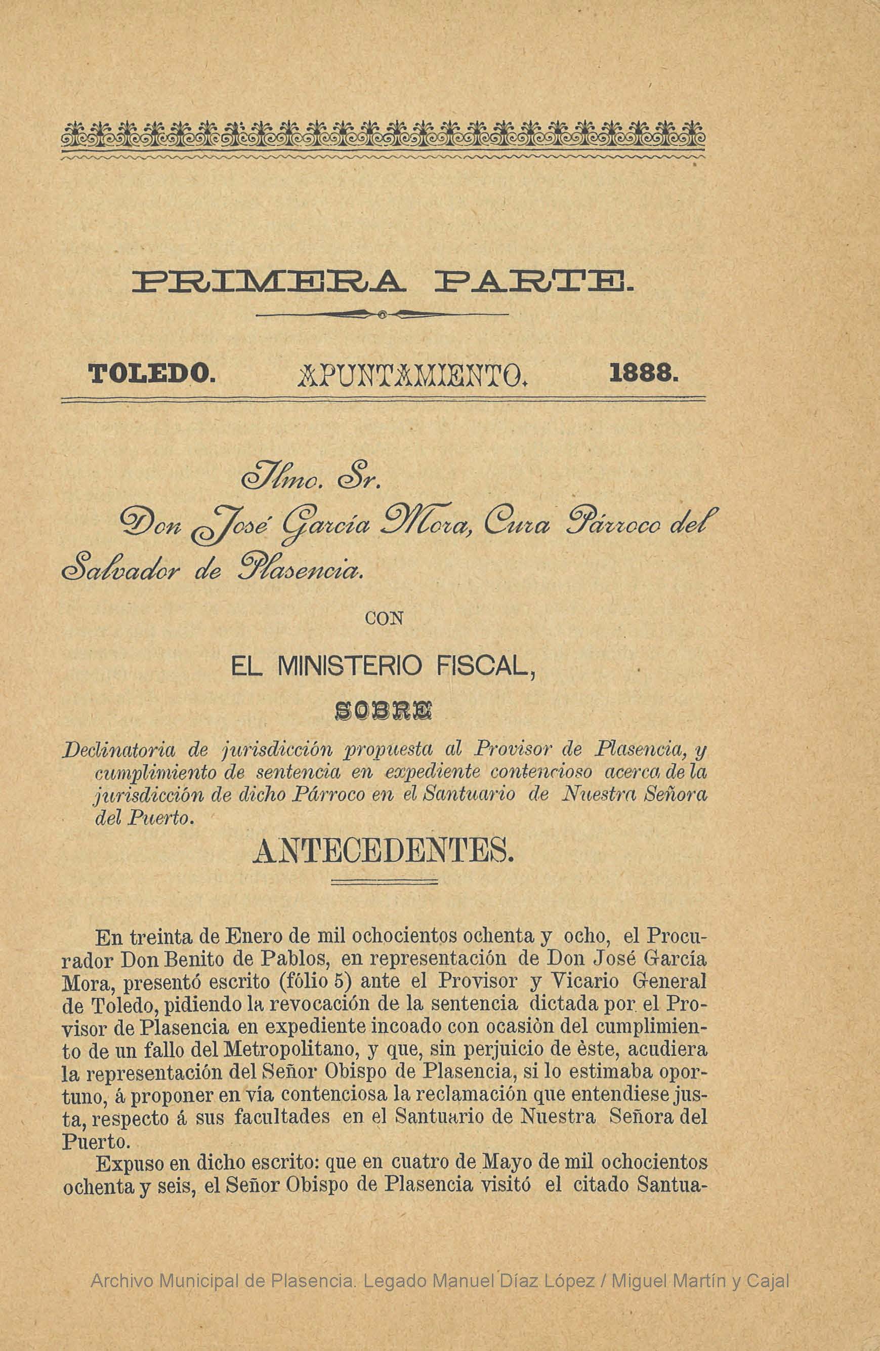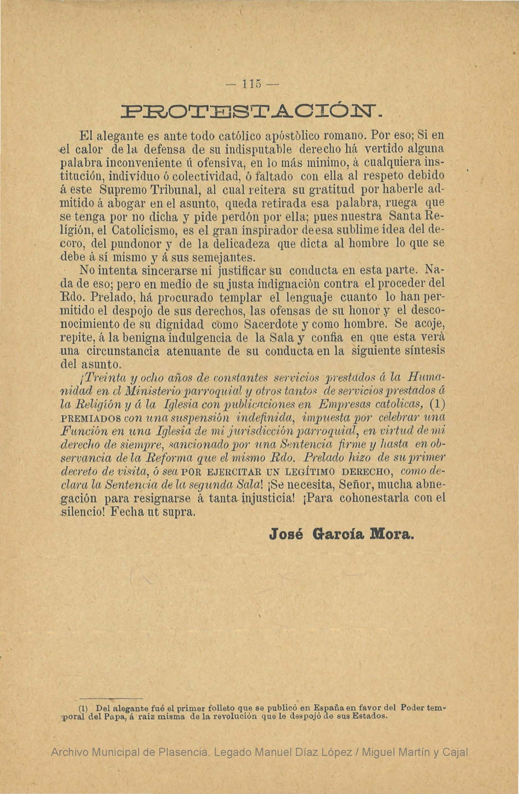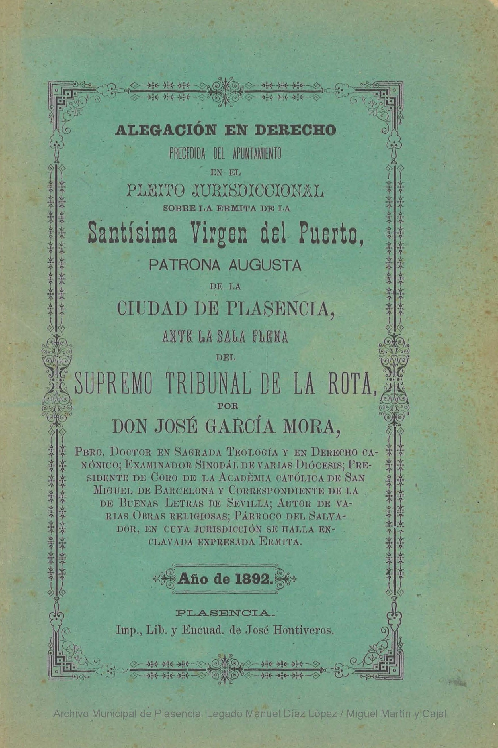 El segundo libro se trata de la "Alegación en derecho : precedida del apuntamiento en el pleito jurisdicional sobre la ermita de la Santísima Virgen del Puerto Patrona Augusta de la ciudad de Plasencia ante la sala plena del Supremo Tribunal de la Rota", de José García Mora, del año 1892 e impreso por la imprenta placentina de José Hontiveros. Su autor, conocido como “el Cura Mora”, fue una figura destacada en la vida intelectual, religiosa y política del norte de Extremadura en el siglo XIX. Nacido en Plasencia y formado en Teología y Derecho Canónico en Valladolid y Salamanca, desarrolló una intensa trayectoria como sacerdote, escritor y pensador. Su biografía refleja una personalidad compleja y, en ocasiones, polémica, marcada por su implicación en los debates ideológicos y religiosos de su tiempo.