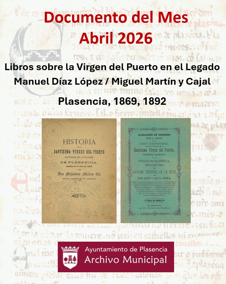 El mes de abril está íntimamente ligado en Plasencia a una de sus celebraciones más significativas: la festividad de la Virgen del Puerto, patrona de la ciudad, cuya romería se celebra el domingo siguiente a la Pascua de Resurrección, este año el domingo 12 de abril. Coincide además este mes con la efeméride del Día del Libro, el 23 de abril. Uniendo estas dos celebraciones, desde el Archivo Municipal hemos elegido como documento del mes dos libros que nos permiten acercarnos a la historia y a la devoción en torno a la Virgen del Puerto. Pertenecen los dos a la recientemente incorporada donación del Legado Manuel Díaz López / Miguel Martín y Cajal, la cual ha enriquecido extraordinariamente nuestro patrimonio bibliográfico local.