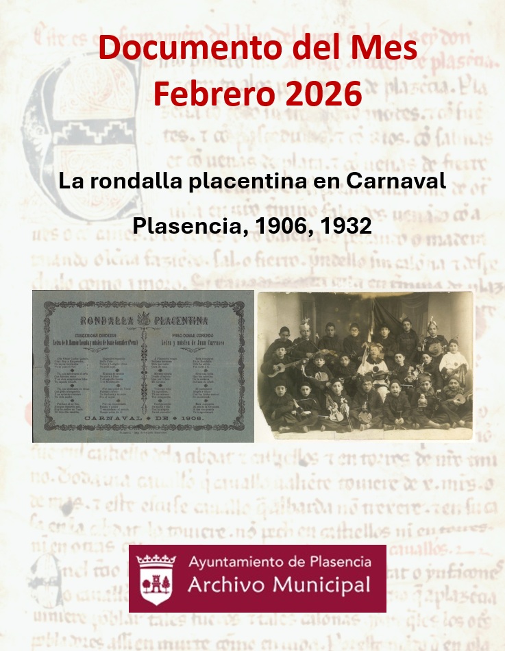 Este mes de febrero, mes frío y lluvioso, es también un mes con una celebración tradicional, el Carnaval. Por ello os traemos como Documento del Mes un cartel del Carnaval de la Rondalla Placentina de 1906. Acompañamos al cartel una fotografía de la Rondalla Placentina del año 1932. Los dos documentos pertenecen al Legado Manuel Muñoz Palomino.
