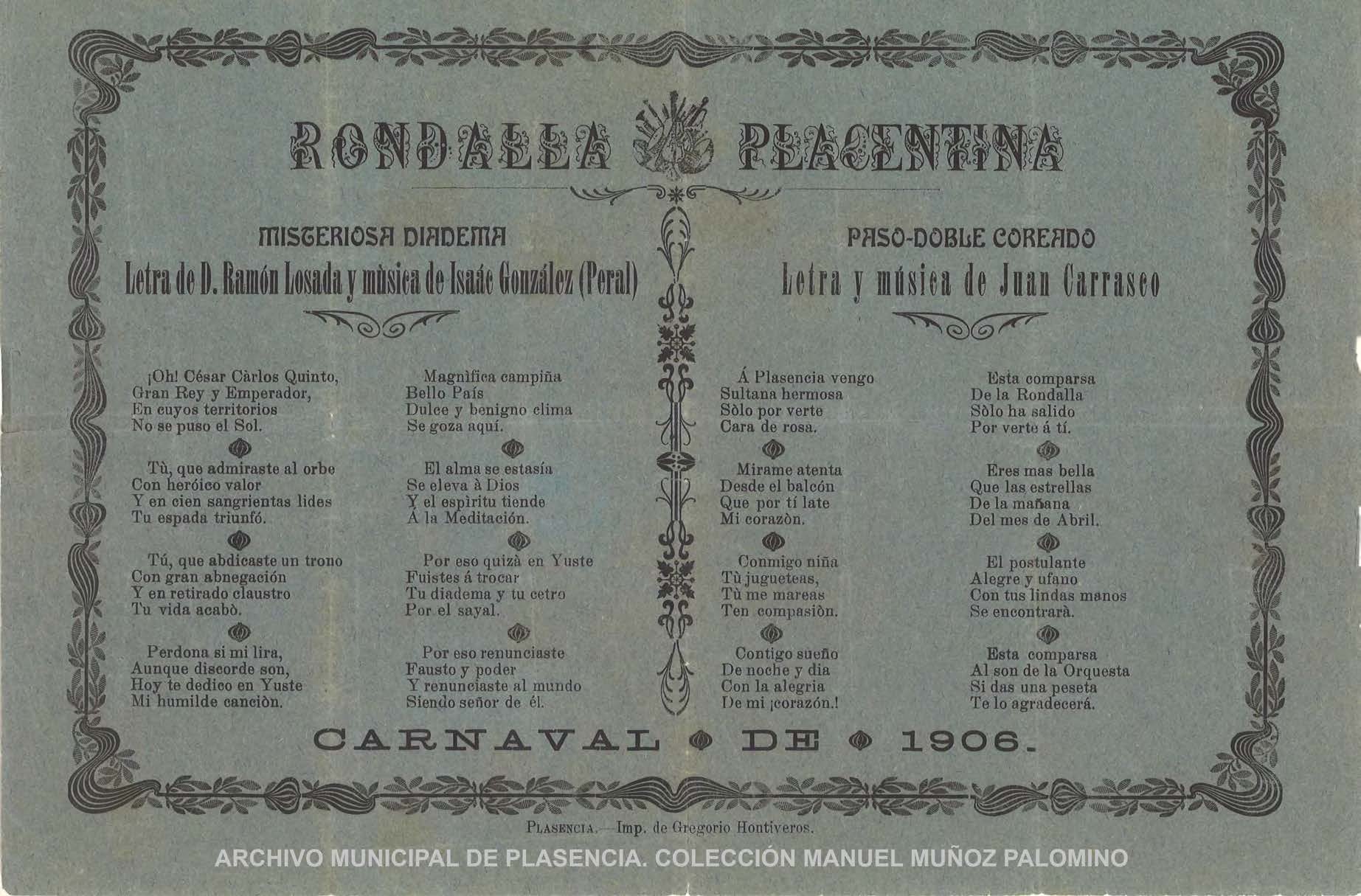 El cartel incluye, una canción de temática histórica dedicada a Carlos V titulada “Misteriosa Diadema” con letra de Ramón Losada y música de Isaac González (Peral) y otra de carácter amoroso titulada “Paso-doble coreado” con letra y música de Juan Carrasco. La canción histórica remite a la memoria del emperador retirado en Yuste, convertido a finales del siglo XIX y comienzos del XX en símbolo de grandeza pasada, orden y catolicismo ejemplar. El retiro y muerte de Carlos V en Yuste contribuyó a que la población del norte de Extremadura lo percibiera no como un monarca lejano, sino como una figura cercana y casi local, siendo una especie de orgullo comarcal. Estos tres temas grandeza pasada, religiosidad y sentimiento de pertenencia territorial se reflejan en la canción “Misteriosa diadema”. Para una rondalla de clase media, cantar a Carlos V suponía mostrar formación y vincular la ciudad de Plasencia a la gran historia de España.